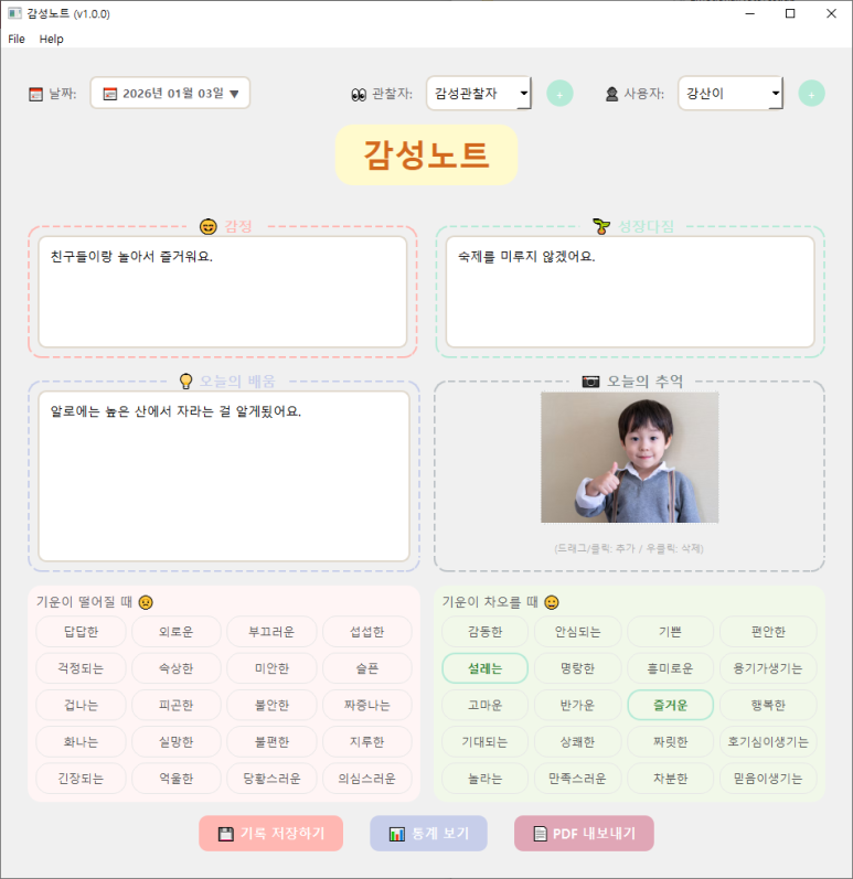 “친구들이랑 놀아서 즐거웠어요”처럼 오늘의 기분을 자유롭게 써요. 아래에는 40개의 감정 단어 버튼이 있어서 클릭 한 번으로도 입력할 수 있죠.